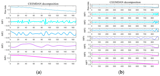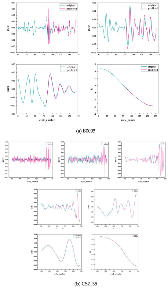 As can be seen from Figure 7 and Figure 8, there are phenomena such as noise and capacity regeneration in the battery capacity. In order to reduce the interference of these phenomena on the data, CEEMDAN is used to decompose the capacity data. Taking the B0005 battery and CS2_35 battery as examples, they are decomposed into multiple groups of high-frequency signals and a group of residual signals, as shown in Figure 9.