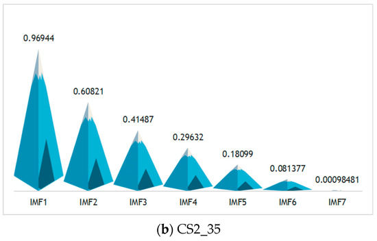 We utilize sample entropy to evaluate the effect of decomposition. Sample entropy is an improved method based on approximate entropy to measure the complexity of a time series. It measures the complexity of a time series by measuring the probability of new changes in the signal. On the other hand, the calculation of sample entropy is independent of the length of the data, thus it has good consistency for the sequence before and after. The larger the sample entropy, the lower the stability and the higher the complexity of the time series. Figure 10 shows the sample entropy of the modes after decomposition for the B0005 battery and CS2_35 battery. As can be seen, the sample entropy of the modes has obvious differences and does not overlap, which indicates that the decomposition effect is good.