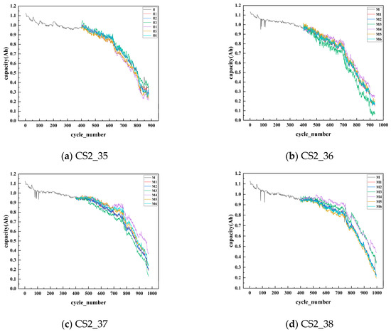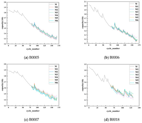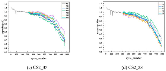 To validate the predictive performance of the proposed RUL model for lithium-ion batteries, this study conducted multiple sets of comparative simulation experiments. In these experiments, M represents the real data curve, M1 denotes the data curve obtained using the model proposed in this paper, M2 represents the data curve obtained using the EEMD-IHSSA-LSTM-TCN model, M3 stands for the data curve obtained using the standalone TCN model, M4 is for the data curve obtained using the standalone LSTM model, M5 represents the data curve obtained using the SSA-LSTM model, and M6 corresponds to the data curve obtained using IHSSA-LSTM. The predicted starting points for batteries B0005, B0006, B0007, and B0018 are 80, 80, 80, and 65, respectively. The prediction results for the four battery models are shown in Figure 12, and the evaluation metrics are presented in Table 2. Additionally, batteries CS2_35, CS2_36, CS2_37, and CS2_38 all have a common starting point of 400, and their prediction results are illustrated in Figure 13, with corresponding evaluation metrics listed in Table 3.