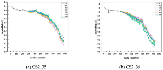 In the above equations, is the predicted capacity value and is the actual capacity value. RMSE represents the square root of the ratio of the squared deviations between the fitted data and the original data to the number of observations. MAE is the average distance between the predicted values of the model and the true values of the samples. Smaller values of RMSE and MAE indicate higher accuracy, better stability, and overall better model quality.
