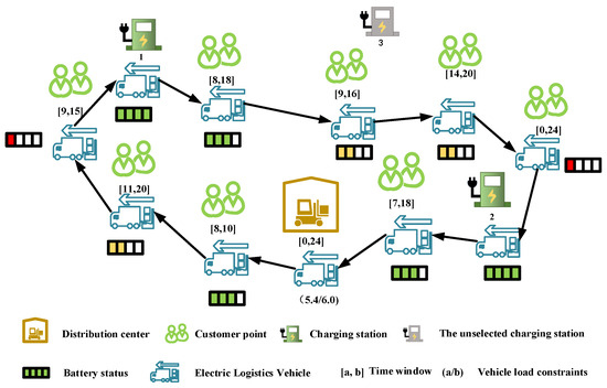 The transportation scenario proposed in this paper has the following assumptions: (1) There is no delivery demand at the charging station, so the demand is 0. (2) The ELV will not visit the next charging station immediately after visiting one charging station. (3) The driving speed of the ELV is uniform. (4) Each charging station has a sufficient number of charging posts. (5) The ELV does not consume power when it stops at a customer point.