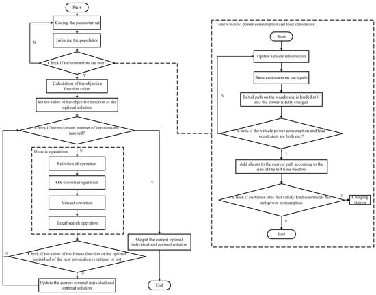 In the TW-LC problem, there are three cases of node locations, which are the distribution center, customer point, and charging station. The rules for path construction when the ELV passes through different nodes are as follows, and the flowchart is shown in Figure 2.