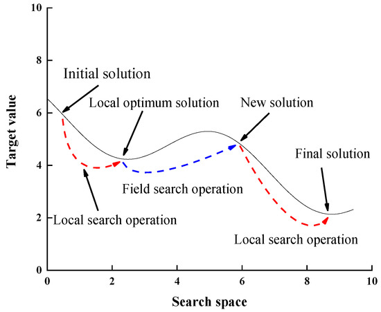 Local search is a heuristic algorithm for solving optimization problems and a type of greedy algorithm, which selects the best solution from the solution space of the domain of the current solution as the current solution for the next iteration each time until a locally optimal solution is reached. Starting from the local optimal solution, the domain of the current local optimal solution is searched; if there is a better solution, then the algorithm moves to it and continues to perform the search, and if not, then it stops and obtains the local optimal solution. The specific process is shown in Figure 3.
