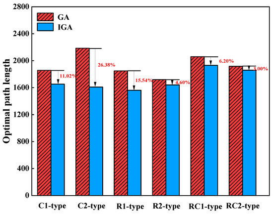 Figure 4 compares the objective function of the algorithms, i.e., the optimal path length. It can be seen that the improved genetic algorithm performs better in all kinds of arithmetic cases. In particular, the improvement is more obvious when dealing with the C-series arithmetic cases, whose distribution is characterized by clustering.