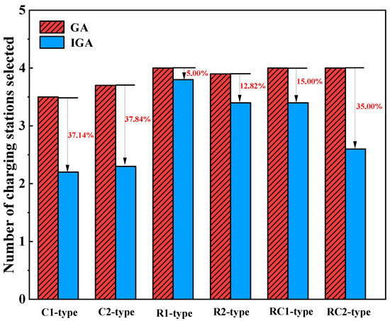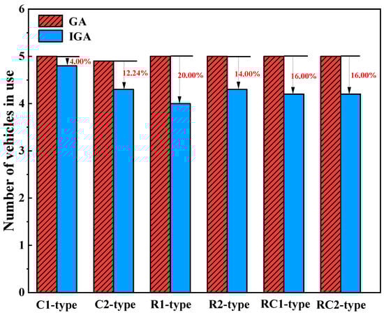 Figure 5 and Figure 6 compare the number of charging stations selected and the number of vehicles in use for the two algorithms. Selecting fewer charging stations and using fewer distribution vehicles under the same conditions will reduce the total cost of transportation. The improved genetic algorithm significantly improves the number of charging stations selected, even in more complex distribution examples such as the RC series, and it can significantly reduce the number of charging stations selected and increase the utilization rate of charging stations. In terms of the number of vehicles in use, the traditional genetic algorithm selects the maximum number of vehicles in all three series of examples, while the improved genetic algorithm, which incorporates the idea of the farthest-insertion heuristic into the algorithm, tries to rationally arrange and insert customer points into the path to maximize the reduction in the use of vehicles.