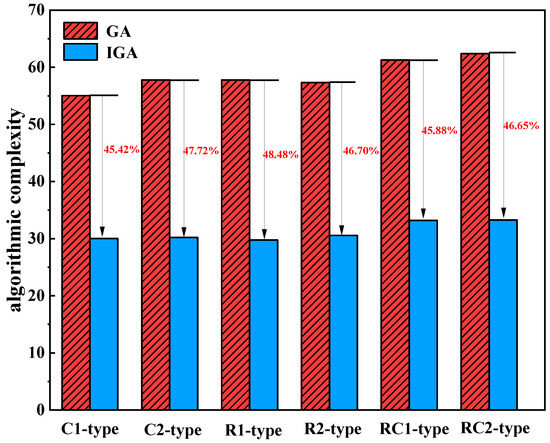 Figure 7 compares the algorithm complexity of the two algorithms. The traditional genetic algorithm easily falls into local optimal situations after iterating a certain number of times, which means that the objective function is not the global optimal value; at the same time, it also improves the complexity of the algorithm. As the improved genetic algorithm adds the idea of the local search, the method of destruction and repair is utilized in the solution, and the chromosome sequence of the optimal value is split and reorganized, which effectively prevents the algorithm from falling into the local optimal situation and shortens the solution time while improving the accuracy of the results.