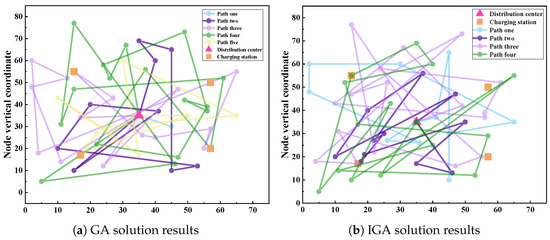The genetic algorithm designed in Section 3 was utilized to solve the model proposed in Section 2. In each set of algorithms, 50 points were randomly sampled as customer points. In addition to that, the node set contained one distribution center and four alternative charging stations, and up to five ELVs were available to provide distribution services. Each series of algorithms was run ten times to collect data such as the optimal path length, the number of constraint-violating paths, the number of charging stations selected, and the solution time. The results are shown in Table 4.