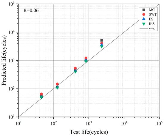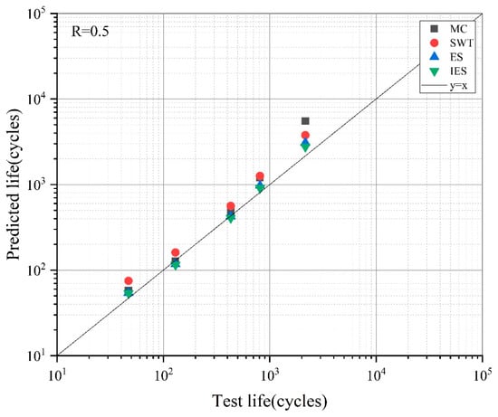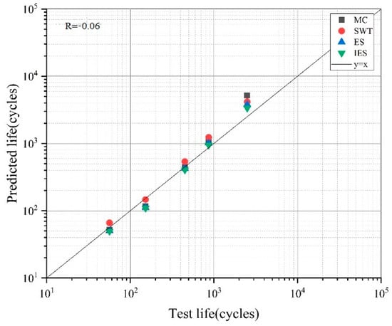 To visually compare the errors between the calculated results of several models and the real results, the data were plotted as shown in Figure 2, Figure 3 and Figure 4. In the context of the illustration, the horizontal axis serves as a representation of the test life, indicating the actual lifespan or endurance of a particular component under evaluation. On the other hand, the vertical axis depicts the predicted life, reflecting the estimated or calculated durability expected based on analytical models or simulations. By comparing the predicted life against the test life and examining the alignment of data points with the ideal y = x line, researchers can assess the accuracy and reliability of their predictive models in forecasting the performance and longevity of the tested materials or structures.