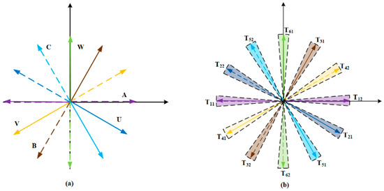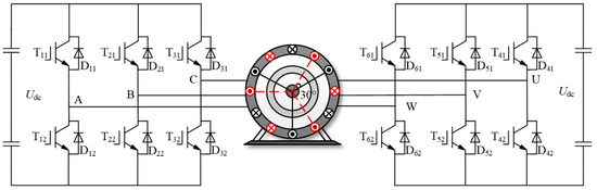 The main circuit topology of the dual three-phase PMSM driving system is shown in Figure 1. The stator consists of two groups of three-phase, symmetrical windings that are connected in a Y-shape. The two groups of windings are spatially separated by an electrical angle of 30° and are fed by a six-phase voltage source inverter. To simplify research and analysis, it is assumed that the back EMF of the motor is sinusoidally distributed.