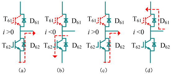Current paths under different switch states and current directions (The red arrow shows the current flow direction): (a) iW > 0, T61 = 0, and T62 = 1; (b) iW < 0, T61 = 0, and T62 = 1; (c) iW > 0, T61 = 1, and T62 = 0; and (d) iW < 0, T61 = 1, and T62 = 0.