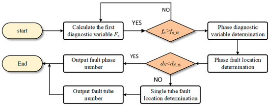 When the judgment condition satisfies the constraint conditions of fn > fn_th and dN < dN_th, according to the judgment of the condition statement, the model will move to the positioning stage of the switch tube fault location. Here, “fn > fn_th” refers to the first diagnostic variable indicator indicating that the system has a fault, while “dN < dN_th” indicates that the phase fault indicator does not change and there is no open-circuit fault. At this point, it indicates that the system has a fault but not an open-circuit fault, that is the switch tube open-circuit fault. The model will execute the switch tube positioning program to determine the specific fault tube position.