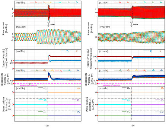 Experimental validations were conducted to assess the robustness of the proposed fault diagnosis scheme during transient operations, specifically evaluating speed and load response. Figure 8a depicts an acceleration experiment where a constant torque of 5 N·m was applied, increasing the speed from 400 r/min to 800 r/min within 0.5 s after achieving stable operation for a certain duration. Throughout the variable-speed process, transient step phenomena were observed in the intermediate variables. In the load variation experiment shown in Figure 8b, after accelerating and maintaining a stable speed of 800 r/min for a specific period, the load was abruptly increased to 8 N·m within 0.5 s due to loading effects. This led to an increase in phase current amplitude and intermediate variables, resulting in changes in motor speed and load; however, these variations did not affect fault diagnosis as protection strategies employed an undershoot threshold setting method. During the testing period, all intermediate variables consistently remained above their thresholds while the fault detection index DN consistently maintained a zero value, thereby validating both the effectiveness and stability of this diagnostic approach during transient operations.