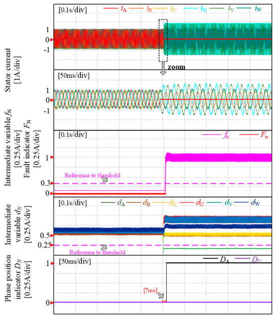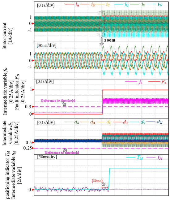 The fault diagnosis experiment of loading a U-phase open-circuit PMSM drive with an A-phase open-circuit fault is depicted in Figure 10. Under normal operating conditions, the fault occurrence index fn remains significantly lower than its threshold value fn_th. However, when the U-phase experiences OPF following the A-phase, throughout the entire process, the fault occurrence index fn consistently exceeds the threshold value fn_th, indicating that the initial step of diagnosis is always responsive. Before the U-phase fault, the phase indicator DA consistently remains at 1; after the fault occurs, dU rapidly decreases. Within 7 ms, the fault phase indicator DU transitions from 0 to 1, signifying completion of the diagnostic process. Throughout this process, four additional intermediate variables dB~dC and dV~dW all surpass their thresholds while indicators dB~dC and dV~dW remain zero; thus ensuring no misjudgment in this procedure.