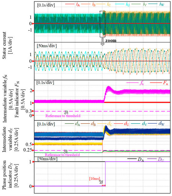 Figure 9 depicts the experiment of fault diagnosis in the PMSM drive system under open-circuit fault conditions in phase A. During normal operation, the phase A current exhibits a sinusoidal waveform with the fault occurrence index fn significantly below its threshold fn_th. However, when an open-circuit fault occurs in phase A, the current drops to zero and remains constant. At this point, the fault occurrence index briefly exceeds its threshold fn_th, resulting in the transition of the fault flag Fn from 0 to 1 within 5 ms, indicating that a fault has occurred and completing the first diagnostic step. After an open-circuit fault occurs in phase A, intermediate variable dA rapidly decreases below its threshold and causes a surge of DA from 0 to 1 within 10 ms signifying the completion of the diagnostic process. Additionally, all five intermediate variables dA−dV remain above their thresholds confirming no false positives during diagnosis.