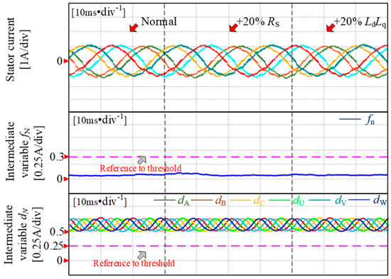 The stability of the diagnostic strategy is verified by introducing a 20% error separately in the d–q axis inductance and stator resistance and observing its impact on the diagnostic results. As depicted in Figure 12, parameter deviations cause minimal fluctuation in the waveform of intermediate variables during fault occurrence, which is significantly smaller than the maximum error of 0.1 A under normal conditions. The diagnostic intermediate variables fn are much smaller than the threshold fn_th, while the phase diagnostic intermediate variables dn are much larger than the threshold dN_th. Based on this analysis, it can be concluded that when parameter errors are introduced during healthy motor operation, the diagnostic algorithm performs well, and intermediate variable values remain considerably lower than their preset thresholds fn_th and dN_th. This demonstrates that parameter disturbances do not affect diagnosis.