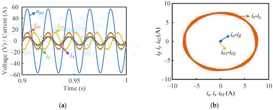 Following this, in order to verify the effectiveness of the proposed method, R1 and R2 are adjusted to 25 Ω and 20 Ω, respectively. It should be mentioned that the desired charging voltage of channel II is calculated by Equation (9) for the purpose of charging torque elimination. The simulation results are shown in Figure 5. As presented in Figure 5a, the balanced grid currents and unity power factor operation are achieved; at the same time, iV is about 30 degrees ahead of iA in phase with equal amplitude, which is consistent with the case that R1 = 25 Ω and R2 = 25 Ω. Additionally, the current trajectories are depicted in Figure 5b, where the excitation of the α–β subspace is shaped like the original, indicating no charging torque generation. Concurrently, dual-channel charging voltage and power values are shown in Figure 5c and Figure 5d, respectively. Notably, the actual charging voltages accurately follow their setpoints while maintaining balanced dual-channel power values, which exhibit the same steady performance as the case where R1 = 25 Ω and R2 = 25 Ω.