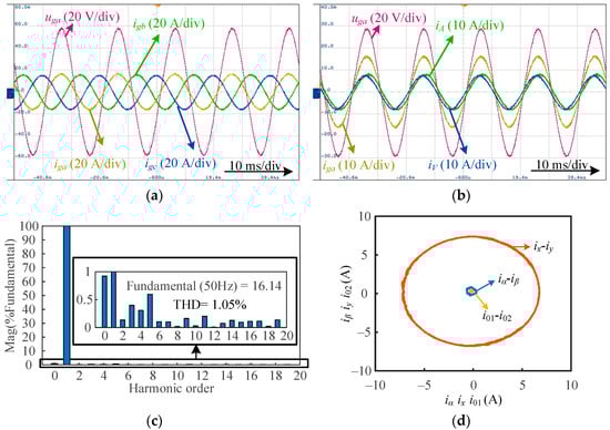 Subsequently, the experiment is conducted under the unbalanced charging voltage operation mode, with R1 = 25 Ω and R2 = 20 Ω. The charging voltage of channel I is set to 125 V. In order to eliminate the charging torque discussed in Section 2.3, the charging voltage of channel II is calculated using Equation (9). The results are shown in Figure 9. The balanced grid currents and the unity power factor operation are realized as in Figure 9a. Similar to the balanced charging voltage operation mode, iV is about 30 degrees ahead of iA in phase and iA has the same amplitude as iV, as presented in Figure 9b. Additionally, the grid current iga follows a THD of about 1.02%, as shown in Figure 9c. The decoupled current trajectories are drawn in Figure 9d. It can be seen that the current trajectory in the α–β subspace is a proximate origin in shape, which means there is no charging torque generation. At the same time, Figure 9e,f present the active power values (P1 and P2) and the charging voltages (udc1 and udc2) of two channels. Notably, the dual-channel power values remain balanced, and the charging voltages precisely track their respective desired values during the steady-state operation mode, as shown in Figure 9e. Figure 9f depicts the dynamic performance, where the transition from a 120 V to a 130 V charging voltage exhibits a smooth curve, with a response time of approximately 100 ms. Throughout the process, the actual dual-channel charging voltages accurately follow their setpoints, while maintaining balanced dual-channel power values.