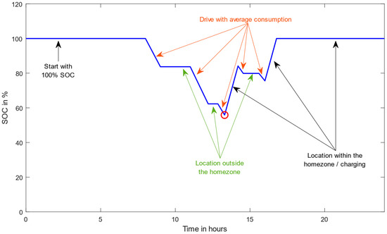 It is assumed that the vehicles have an SOC of 100% at the start of the measurement at the company premises. Figure 1 shows a calculated SOC curve based on the sample data from Table 2.