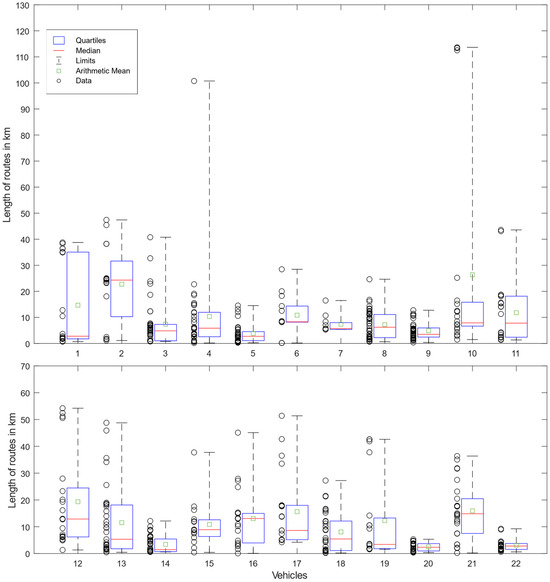 Figure 2 shows that the maximum route lengths of the vehicles vary up to a length of 113.65 km. However, 20 of the 22 vehicles examined did not cover any routes with a total length of more than 55 km during the measurement period. Two of the vehicles covered routes longer than 100 km. The median of the measurement data (shown in red) ranges from 1.45 km to 24.30 km. It should be noted that the medians of the two vehicles with route lengths of over 100 km, at 5.86 km and 7.89 km, tend to be in the medium range of the vehicles considered, and the majority of the routes covered by these vehicles tend to be shorter. The arithmetic mean (shown in green) of the route lengths of all vehicles considered is between 2.51 km and 26.36 km. The quartiles are shown in blue and the respective limits (all data included, no outliers excluded) in black.