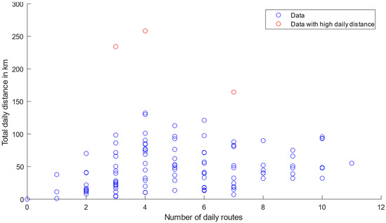 The correlation between the daily number of routes and the daily distances traveled by the vehicles is examined below. Figure 3 shows the scatter plot of the total daily distance covered over the number of daily routes. The figure shows particularly high total daily distances of some vehicles on three days. These three conspicuous data points are marked in red. As the journeys at these three data points actually took place, these points are not sorted out as measurement errors but are also considered separately in the following correlation analysis.