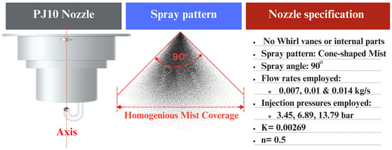 where is the mass fraction of the water vapour, is the diffusion coefficient for the water vapour, is the rate of evaporation (kg/m2/h), and is the mass transfer rate due to evaporation (mol/s). This value depends upon the nozzle, and the nozzle for the investigation was PJ10 due to its ease of implementation. A nozzle diameter of 1 mm was considered for the simulation. The nozzle specifications and spray pattern are portrayed in Figure 2.