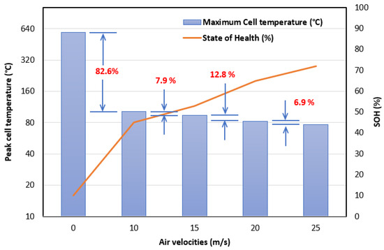 The reduced peak cell temperature helps in improving the SOH of the battery, as the capacity is the function of temperature. When the air velocity is increased to 10 m/s from the no cooling condition, the maximum cell temperature is reduced by 82.6%. But when it is increased from 20 m/s to 25 m/s, the % reduction in cell temperature is only about 6.9%. It can be interpreted that an increase in air velocity beyond a certain limit does not cause a drastic drop in the maximum cell temperature and helps temperature attenuation.
