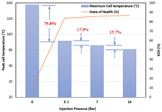 Figure 4 represents the variation in peak cell temperature and the corresponding SOH at different injection pressures. The percentage of deviation from zero to 3.5 bar was 79.8%, which is a substantial amount, inferring the magnitude of positive thermal attenuation. As the injected pressure increased from 3.5 to 7 and then again to 14 bar, the percentage of depreciation in the temperature reduction also reduced from 17.9% to 15.7%, indicating that increasing injection pressure beyond 14 bar does not serve to increase temperature attenuation. The lowest peak cell temperature observed was 82.31 °C, which is higher compared to forced convection. It also indicates that the mist cooling strategy is not sufficient to act effectively as a stand-alone cooling system at higher C-rated conditions.