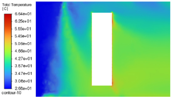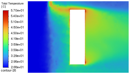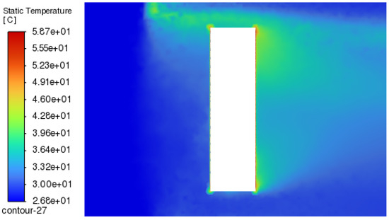 It is essential to investigate the combined influence of forced convection velocities and mist injection pressures on the thermal attenuation characteristics as in the case of multi-strategical approaches. It can be inferred from the results that the maximum attenuation of the cell temperature happens at the injection pressure of 7 bar and air velocity of 25 m/s. The contour plot of cell temperature at the specified condition is presented in Figure 5. Due to the forced convection, there is a positive chamfer in the angle of the spray, which, in turn, increases the spread and effectiveness of the mist application. The area where the mist is introduced could be correlated with its effectiveness and, thus, temperature attenuation.