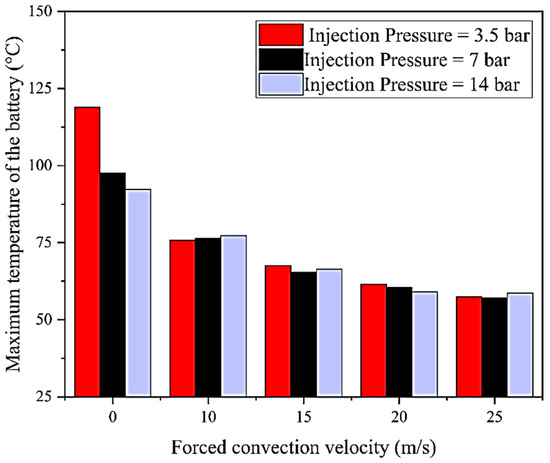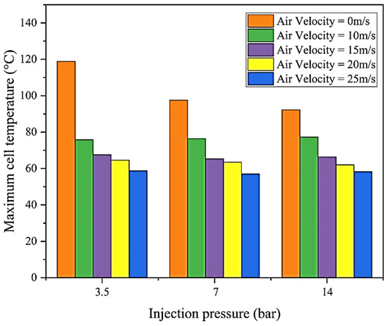 The temperature contours showcased in Figure 14a–d exhibit the positive impact of AFI on thermal attenuation. All these results demonstrate that a further reduction in peak cell temperature is possible by employing AFI. This is also manifested from the simulation results shown in Figure 14e. Even for the best scenario, the peak cell temperature could be reduced with the incorporation of AFI. The impact of AFI on the cell peak temperature over a range of air velocities and injection pressures is portrayed in Figure 15.