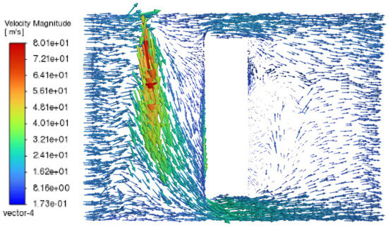 Whilst the injection pressure is predominant over air velocity, the maximum area over which the mist is exposed is the bottom part of the cell. A velocity magnitude contour over the central XY plane is created to showcase the effect of injection pressure overwhelming the effect of forced air convection. This is shown in Figure 8. This condition also corresponds to lower effectiveness and, hence, lower temperature attenuation. This is evidenced in the case of air velocity at 15 m/s and an injection pressure of 14 bar. This is shown in Figure 9. Similar to this is the case when the air velocity overwhelms the injection pressure, the only difference being that the velocity follows a trajectory over the upper part of the battery.
