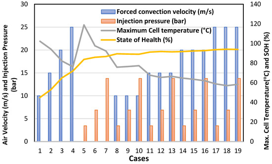 The interpretation of SOH for the battery cell is performed over the entire spectrum of cases considered in the present study. The notation is as follows: (a) case 0—no cooling, (b) cases 1 to 4—standalone forced air cooling system, (c) cases 5 to 7—standalone mist cooling, and (d) cases 8 to 19—a multi-strategical cooling approach that combines the forced air and mist cooling. This is shown in Figure 11.