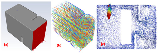 The new control volume is represented in Figure 13a. The red colour indicates the outlet. The AFI creates disruptions in the path of airflow and fluid mist flow. This discrepancy is channelled towards the hotspots of the battery peak cell temperature, which, in turn, alleviates the cell peak temperature due to the greater surface area of the cell being exposed to the cooling effect and with better turbulence intensity.