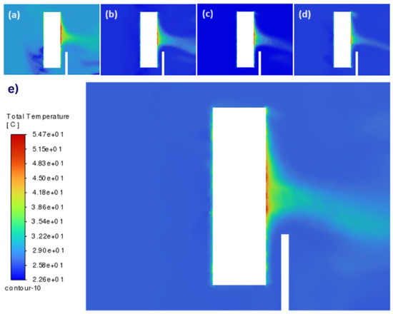 Simulated temperature contours in a combinational approach when (a) V = 15 m/s, P = 7 bar, (b) V = 20 m/s, P = 7 bar, (c) V = 25 m/s; P = 3.5 bar, (d) V = 25 m/s; P = 7 bar, and (e) V = 25 m/s; P = 7 bar with AFI.