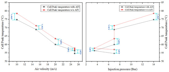 Impact of AFI on the cell peak temperature over a range of air velocities and injection pressures.