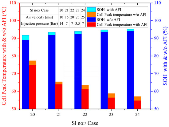 Figure 16 indicates that AFI has a positive impact on attenuating the cell peak temperature. The improvement in SOH, as well as peak cell temperature attenuation, is illustrated. Despite the improvement in SOH, a declining trend is observed in %. It was 2.98% in the initial stage, which dropped to 1.06% in the final stage. On the contrary, the rate of reduction in peak cell temperature increased from 3.22% to 4.02% after each considered case.