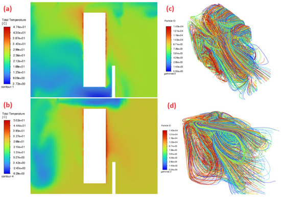 Impact of additive addition on cell temperature for (a) the case of maximum reduction and (b) the case of minimum reduction (c,d) with the path line contour showing the increased turbulence distribution.
