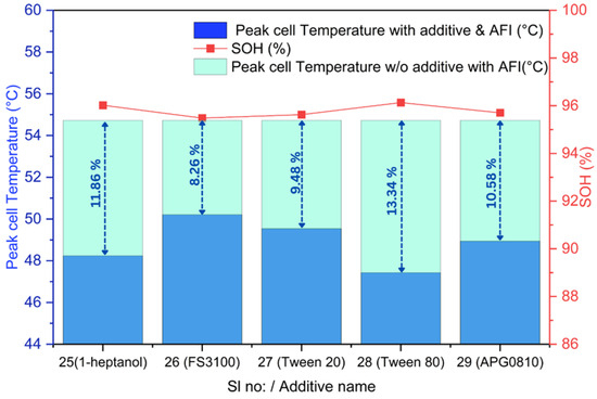 The impact of the additive addition on thermal attenuation characteristics is exhibited in Figure 17a,b. For this specific investigation, the best case in the form of a combinational cooling approach was considered. Water mixed with 3% (by wt.) of tween 80 additives can reduce the peak temperature by about 13.34%. Among the additives, minimal performance is observed with FS 3100, but still, the peak temperature can be lowered by 8.26% compared to unadulterated water. The pathline contour obtained for these two cases is, respectively, shown in Figure 17c,d. Greater turbulence and the formation of smaller eddies were observed with Tween 80. This helped enhance the turbulence intensity in the flow field, thereby increasing the heat transfer between the battery surface and the working fluid. Figure 17 showcases both the best-case temperature depreciation due to the addition of Tween 80, constituting about a 13.34% reduction, as well as the highest peak cell temperature observed with FS3100, which still managed to reduce the peak temperature by 8.26%. This indicates that the addition of additives with water, along with the corresponding deformer, could positively contribute to a reduction in cell peak temperature. The differences in path lines plotted from the particle ID showcase the movement of particles inside the control volume. In comparison, Figure 17c shows much more turbulence and the formation of smaller eddies, which enhanced the turbulence intensity in the flow, thereby increasing the heat transfer between the increased accessible surface of the battery and the working fluid. The positive influence of additives on temperature attenuation and SOH enhancement is illustrated in Figure 18. Through the simulation, the effectiveness of additives was evaluated. It followed the order Tween 80 > 1-Heptanol > APG0810 > Tween 20 > FS3100. The lowest peak temperature was noticed with the airflow improviser at the air velocity of 25 m/s and injection pressure of 7 bar with the working fluid of water adulterated with Tween 80.