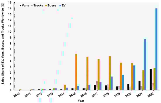 Global sales’ share of different types of EVs between 2010 and 2022 [1].