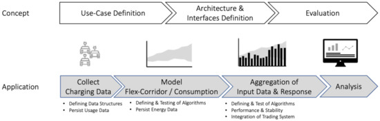 The project was divided into two main work-streams called Concept and Application, as shown in Figure 1. The conceptual work started with the definition of use cases for controlled charging. The focus was thereby set on the use case of spot-market-optimized charging, in which charging processes are influenced by the current electricity spot-market prices. Subsequently, the concept was extended by integrating it with day-ahead markets, which resulted in the design of an aggregation algorithm and the interfaces required to establish a market communication process.