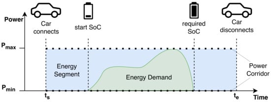 Schematic illustration of a power corridor. The power demand for charging the EV’s battery starting by to the required level can be set between and within the time interval and disconnection of the EV.