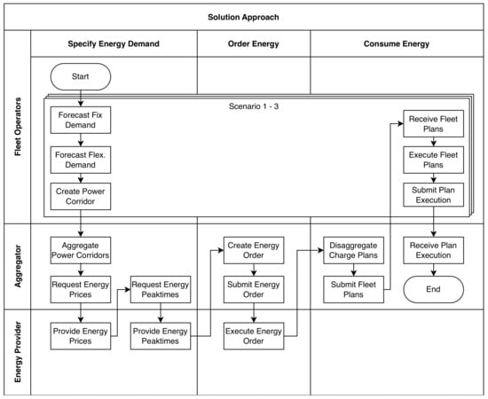 Addressing the challenges according to flexible energy demand, we evaluate three different controlling scenarios, one for each of the three fleet types, small company fleet, rental car fleet, and large company fleet. All scenarios interact with the central aggregation system. The aggregator system transfers information between consumption facilities, generation facilities, and authorized market partners to generate value via the deliberate placement of energy purchase orders influenced by the different interests of the actors. Figure 3 shows the flow of actions that are conducted on a daily basis. The value is generated by the allocation of the forecasted energy demand within the flexible time range of the three consumers. With the incentive to charge when energy prices are low, the overall energy costs should be lowered.