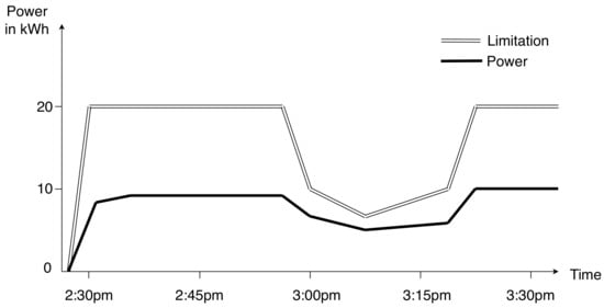 Table 1 shows two example calculations of two energy demands, and , distributed over a seven-hour energy segment , accumulated from for each hour. The power of the charging sessions can be adapted dynamically. In both cases, the energy segment is = 104 kWh. In case , the power limit 30 kW of the infrastructure is the restricting factor at and , so because . In the case , the energy demand of the vehicles is lower, so applies.