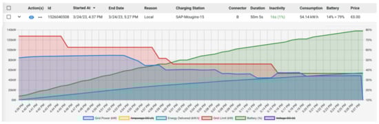 The enabling technology for software-based EV data access was realized with a telemetry service providing integration into the cloud services of the EV manufacturer for processing SoC information in real time. EV drivers from the SAP site in Mougins/France provided their consent for using the charging data for research purposes. For a yearly fee of EUR 60 per car, the service can be used without any hardware dependencies. Figure 6 shows a charging session with real-time optimization considering the SoC is provided by a telemetry service.