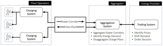 The system mainly serves the needs of three types of entities called “fleet operator”, “aggregator”, and “energy provider”. Each of these has its responsibilities and tasks. The architecture of the demonstrator in Figure 7 shows the entities’ connected systems in a cascading pattern. Each fleet operator runs a charging system to control the energy consumption based on the charge plan for the own EV fleet. The aggregator operates an aggregation system that accumulates the demands from the connected fleet operators and communicates the aggregated flexible loads to the energy provider. In the trading system of the energy provider, the respective purchase orders are created and placed in the energy market.