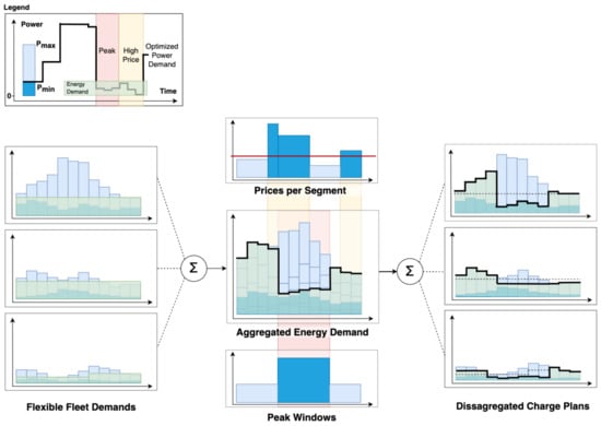 Energy aggregation process. The energy demand is aggregated to place purchasing orders, preferably at times with low prices and no peak loads. The disaggregation considers the minimum and maximum power values communicated by the fleet operators’ charging systems.