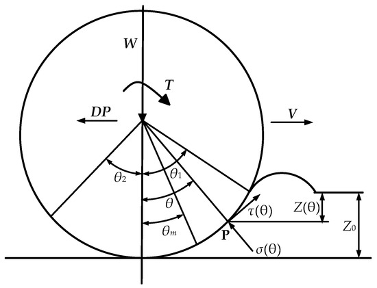 Figure 1 shows the force distribution of tractor wheels on soft ground using a semi-empirical model, where all the forces applied are wheel forces [27,28]. When the driving torque T and the vertical load W act on a wheel with radius r and width b, the wheel rolls forward, and a normal force and shear force are generated on the wheel–soil contact surface, which are used to balance the vertical load and overcome the travelling resistance and to provide the driving force required for the vehicle to move forward, i.e., the hook traction force DP. Z is the amount of wheel sinking, and is the wheel–soil interaction angle. The contact angle range between the wheel and the ground is , where is the angle of the ground first contacted by the rigid wheel in the vertical direction, i.e., the wheel’s entry angle, and is the angle of the ground last leaving the rigid wheel in the vertical direction, i.e., the wheel’s departure angle.