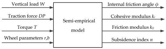 Among the theoretical models of vehicle ground passability, the semi-empirical model is the most classic, combining vehicle dynamics, soil mechanics, and other theories to analyze the wheel–soil interaction, and the key parameters of soil characteristics are basically reflected in this model. Therefore, a semi-empirical model is used here to solve the key parameters of soil characteristics.