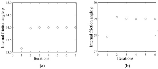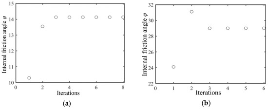 Iteration of soil internal friction angle for different soils based on the condition of 50% initial value error from the true value. (a) Based on wet clay; (b) based on sandy loam.