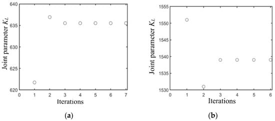 Iteration of joint parameter for different soils based on the condition of 20% initial value error from the true value condition. (a) Based on wet clay; (b) based on sandy loam.