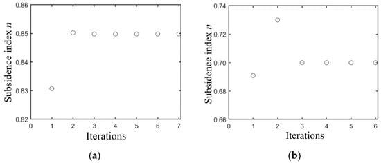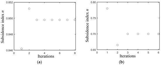 Iteration of the subsidence index for different soils based on the condition of 50% initial value error from the true value. (a) Based on wet clay; (b) based on sandy loam.